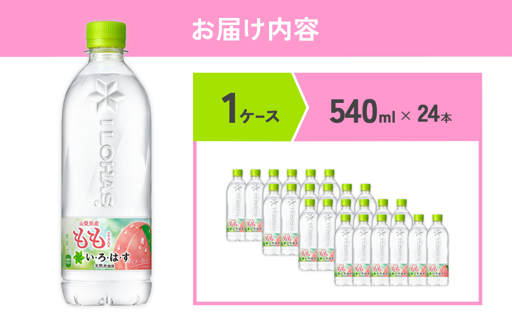 - 水 いろはす もも 天然水 540ml(500ml + 40ml)PET【コカ・コーラ】ペットボトル 1箱(24本) 桃 ナチュラルミネラルウォーター フレーバードリンク カロリー控えめ 飲料水 飲料 常温 備蓄 ストック ローリングストック アウトドア キャンプ 人気 おすすめ ギフト 国産 九州 宮崎県 えびの市 送料無料