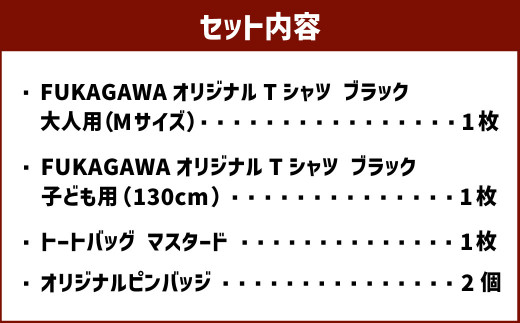【大人:Mサイズ×子ども:130サイズ】FUKAGAWAオリジナルTシャツ ブラック(大人用・子ども用)・トートバック・オリジナルピンバッチ2個セット シャツ Tシャツ 服 ピンバッチ バック トートバッグ マスタード 北海道 深川市