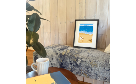 湘南・茅ヶ崎で描く、海を感じるイラストアート 『 湘南ランドスケープ04:渚の遭遇 』 ジークレーアートフレーム (小/木地仕上げ) /絵画 風景 版画