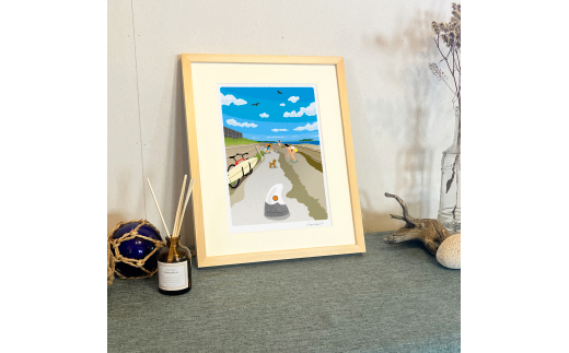 - 湘南・茅ヶ崎で描く、海を感じるイラストアート 『 湘南ランドスケープ12:茅ヶ崎から江ノ島へ、湘南サイクリングロード 』 ジークレーアートフレーム (小/木地仕上げ) /絵画 風景 版画