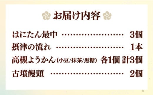 - さつきあん厳選!4種9個詰合せセット(はにたん最中・摂津の流れ・高槻ようかん・古墳饅頭) 饅頭 羊羹 最中 和菓子 はにたん お菓子 和菓子 スイーツ 銘菓 ご当地 最中 もなか ようかん 羊羹 大阪府高槻市/創作銘菓 薩喜庵(さつきあん) [AOAC001]