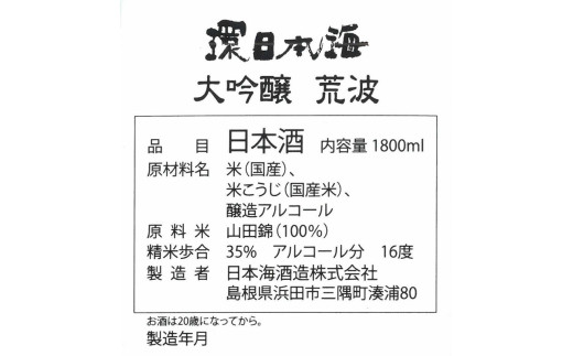 環日本海 大吟醸 荒波1800ml お酒 酒 大吟醸 冷酒 荒波 16度 おすすめ お取り寄せ 【021_0051】