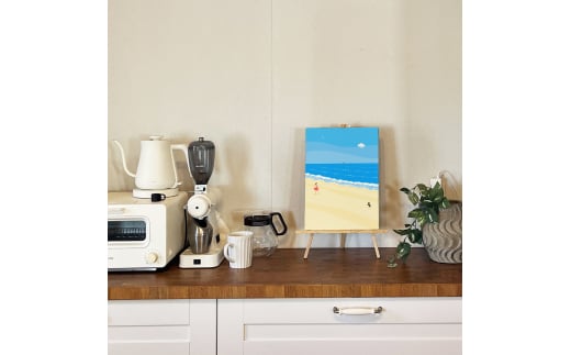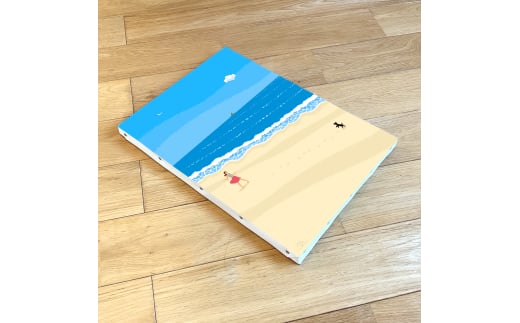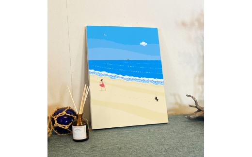 - 湘南・茅ヶ崎で描く、海を感じるイラストアート 『 湘南ランドスケープ01:波打ち際のキャッチボール 』 キャンバスアートパネル(中) 絵画 風景 犬 猫
