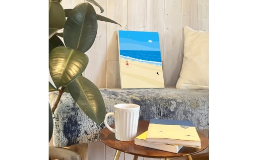 湘南・茅ヶ崎で描く、海を感じるイラストアート 『 湘南ランドスケープ01:波打ち際のキャッチボール 』 キャンバスアートパネル(中) 絵画 風景 犬 猫