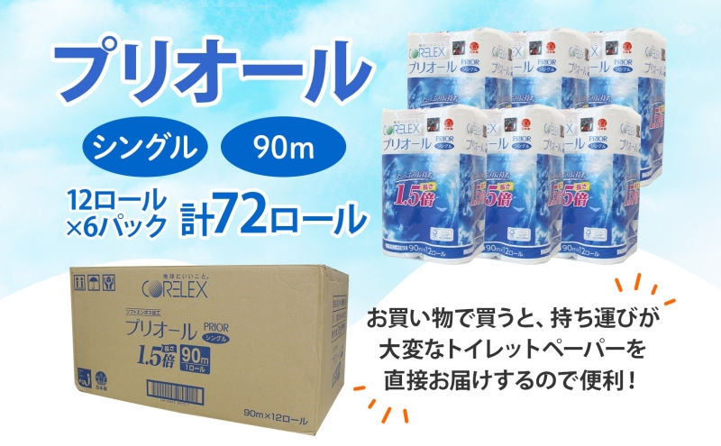 プリオール・ピコ トイレット ペーパー 1.5倍巻き シングル 90m 12ロール 6パック 日本製 まとめ買い リサイクル 防災 常備品 トイレ トイレットペーパー 消耗品 日用品 備蓄 送料無料 北海道 倶知安町 倶知安町
