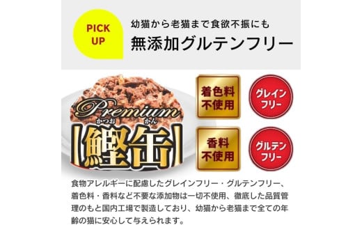 プレミアム鰹缶 猫用(かつお節入り)3缶パック×18個_プレミアム 鰹缶 猫用 3缶パック × 18個 かつお節入り 厳選 かつお タンパク質 食欲不振 ブリーダー 多頭飼い グレインフリー グルテンフリー キャットフード 猫 福岡県 久留米市 送料無料_Pf055-05