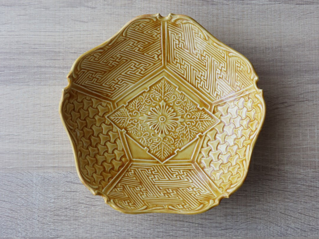 - 有田焼 レリーフ地紋彫 プレート 黄交趾 1枚【山忠】食器 器 うつわ 和食器 皿 深皿 盛皿 鉢 ハレの日 お正月 上品 お祝い 黄色 黄 イエロー 電子レンジ対応 A80-56