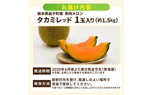 - \果汁たっぷり/栃木県益子町産 タカミレッド 約1.5kg×1玉 (2025年6月発送予定) | ましこメロン 果物 くだもの フルーツ メロン 赤肉 赤肉メロン 旬 贈り物 ギフト 箱入り お取り寄せ 甘い 栃木県産 益子町産 (AA044)