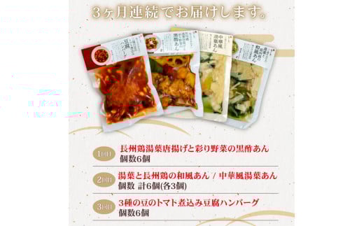 - 梅の花 惣菜 定期便(全3回) 簡単便利 惣菜 定期便 3ヶ月 長州鶏 湯葉 唐揚げ 黒酢 和風 鶏湯葉丼 中華風 中華丼 豆腐ハンバーグ トマトソース 井手町 京都府
