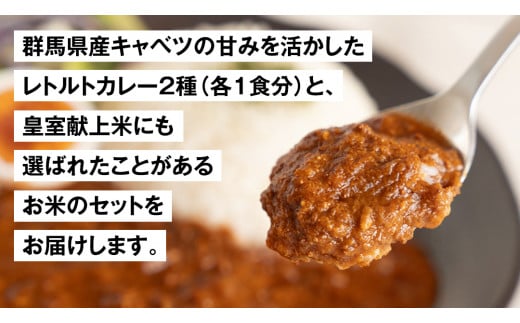- キャベツカレーセット(ぐんまキャベツカレー1個+嬬恋キャベツ入りトマトキーマカレー1個+嬬恋米300g) レトルトカレー 2食分 2人前 キャンプ 食べ比べ お試し 少量 小分け こめ ブランド米 米 白米 精米 受賞 皇室献上米 コメ 2合 詰め合わせ セット [AB085tu]