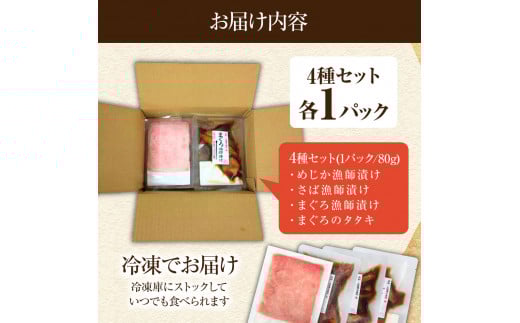 まぐろのたたきと漬け3種食べ比べセット 各1Pずつ 1パック80g マグロ 鮪 さば サバ 鯖 めじか 宗田鰹 まぐろのたたき 海鮮丼 魚 魚介 おかず 惣菜 個包装 真空パック 新鮮【R01204】