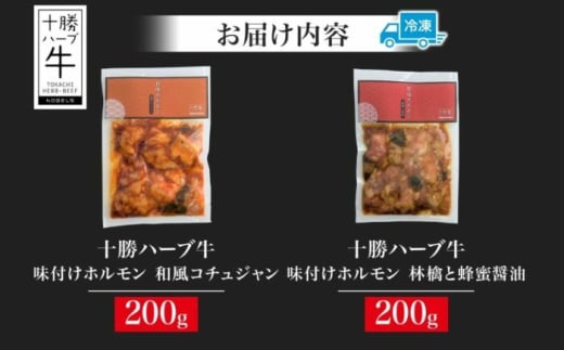 北海道 十勝ハーブ牛 味付けホルモン2種×各200g(和風コチュジャン・林檎と蜂蜜醤油)北海道産 焼き肉 やきにく ミックスホルモン 味付き 和風 コチュジャン 醤油 肉 BBQ 《足寄町》 【日本ふるさと創生株式会社】 [BEBB058]