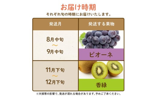 - 【旬のお届け フルーツ定期便 2回】Dセット ピオーネ 約1.2kg 香緑 約3.0kg ぶどう キウイ 旬 フルーツ 果物 国産 香川県 F5J-782