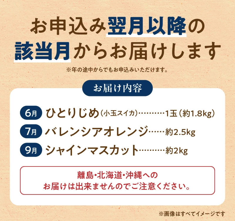 G60-T63_【定期便 全3回】紀州和歌山産旬のフルーツ定期便(スイカ、バレンシア、シャインマスカット)