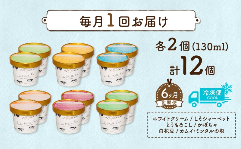 - 定期便 6ヵ月 連続 全6回 北海道 まきばのジェラート 6種 各2個 計12個 セット ジェラート ミルク 赤しそ カムイミンタルの塩 とうもろこし かぼちゃ 白花豆 アイスクリーム 保存料不使用 シャーベット アイス 牛乳 送料無料