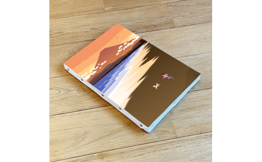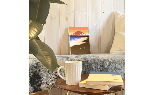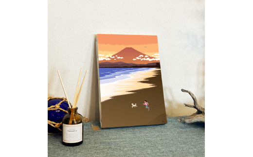 湘南・茅ヶ崎で描く、海を感じるイラストアート 『 湘南ランドスケープ11:湘南の富士と夕焼けの軌跡 』 キャンバスアートパネル(小) /絵画 風景 犬 猫