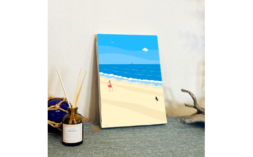 湘南・茅ヶ崎で描く、海を感じるイラストアート 『 湘南ランドスケープ01:波打ち際のキャッチボール 』 キャンバスアートパネル(小) /絵画 風景 犬 猫