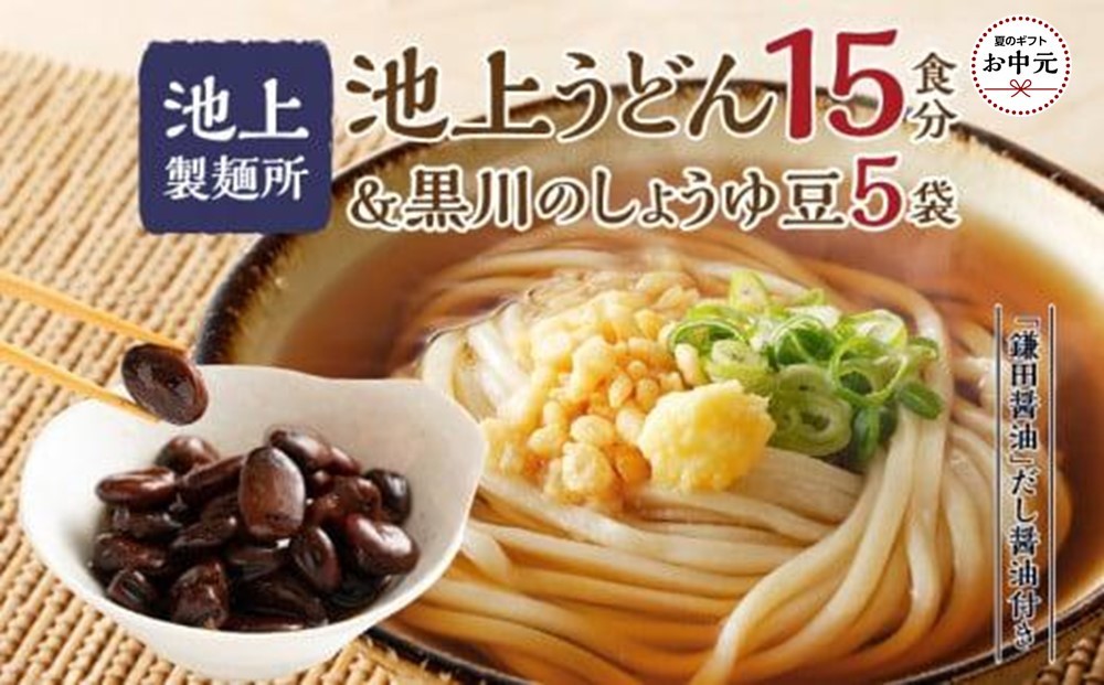 - 池上製麺所うどん15食 黒川のしょうゆ豆5袋・鎌田だし醤油200ml×2本付