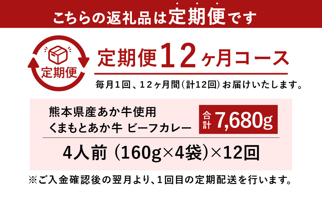 - 【12ヶ月定期便】熊本県産あか牛使用 くまもとあか牛 ビーフカレー 4人前 計640g(160g×4袋)