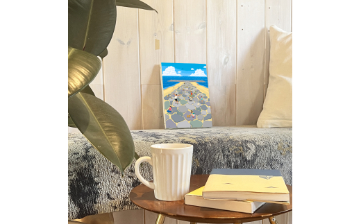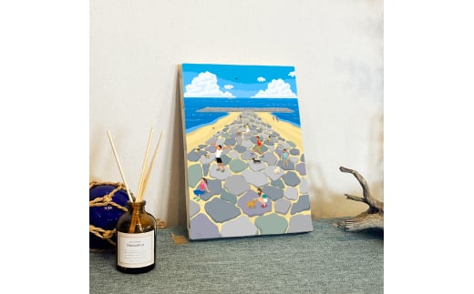 湘南・茅ヶ崎で描く、海を感じるイラストアート 『 湘南ランドスケープ03:茅ヶ崎 ヘッドランド 』 キャンバスアートパネル(小) /絵画 風景 犬 猫