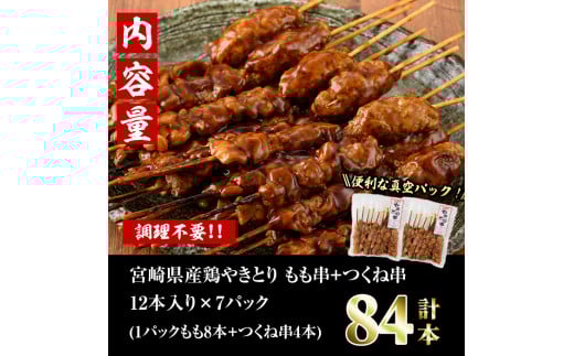 <簡単!電子レンジ調理>国産焼き鳥もも串とつくね串2種セット(合計84本・12本×7)鶏肉 鳥肉 とり肉 焼鳥 小分け タレ漬け おかず おつまみ 惣菜 詰め合わせ 詰合せ 冷凍【V-66】【味鶏フーズ】