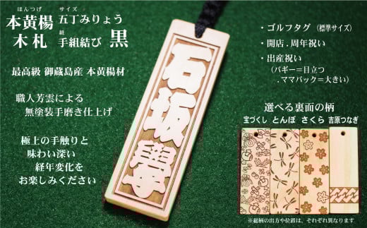 ゴルフ用など◎和風ネームタグ彫刻木札【家紋・短冊入】御蔵島本黄楊(フダヤドットコム.五丁みりょう)(紐:黒、和柄:吉原つなぎ)