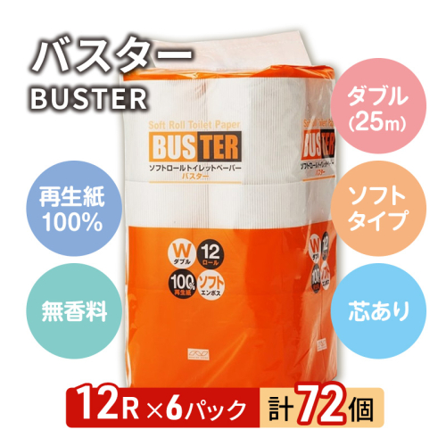 - 【3ヵ月毎 計3回お届け 定期便】トイレットペーパー バスター 12R ダブル (25m×2枚)×6パック 72個 ×3回 日用品 消耗品 114mm 柔らかい 無香料 芯 大容量 トイレット トイレ といれっとペーパー ふるさと 納税