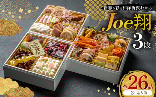 - <福岡・大野城市>婚礼場でも振舞われるプロ仕様おせち「Joe翔3段」和洋風3段重 3~4人前全26品【1654221】