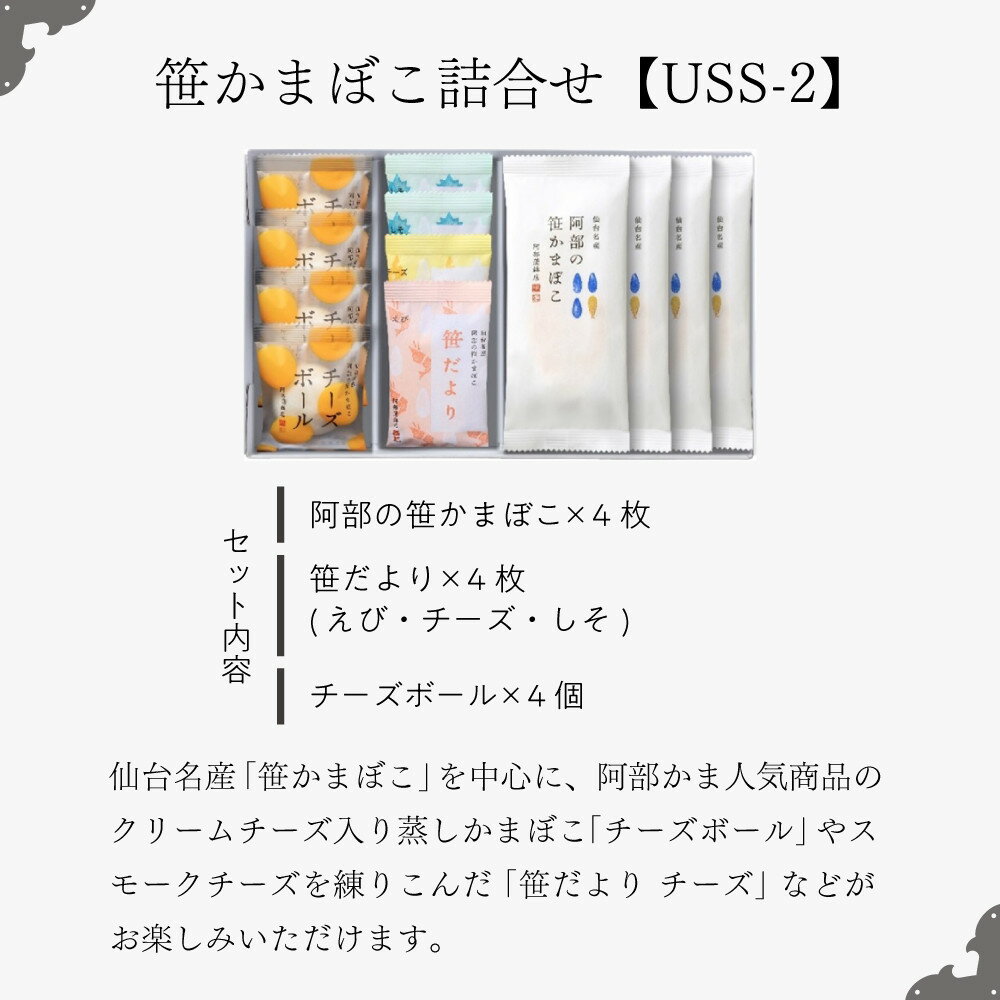 - 【ふるさと納税】阿部蒲鉾店 笹かまぼこ詰合せ USS-2【練り物 魚介類 水産 食品 人気 おすすめ 】 | おつまみ 蒲鉾 かまぼこ 練り物 すり身 農林水産大臣賞 贈答用 父の日 母の日 お中元 お歳暮 大晦日 お正月 宮城県 仙台市