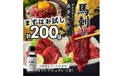 - 【馬刺し】 新鮮こだわり国産馬刺し【馬刺しタレ付き】福岡県産《カタ・ヒレ》(カタ100g×1P・ヒレ100g×1P)_馬刺し カタ ヒレ 各 100g × 1袋 計 200g 特製 甘口醤油ダレ 100ml × 1本 国産 福岡県産 新鮮 生食用 赤身 真空包装 個包装 急速冷凍 肉 馬肉 ブロック 冷凍 食べ比べ 小分け 便利 低カロリー 高たんぱく お取り寄せ 福岡県 久留米市_Ah027