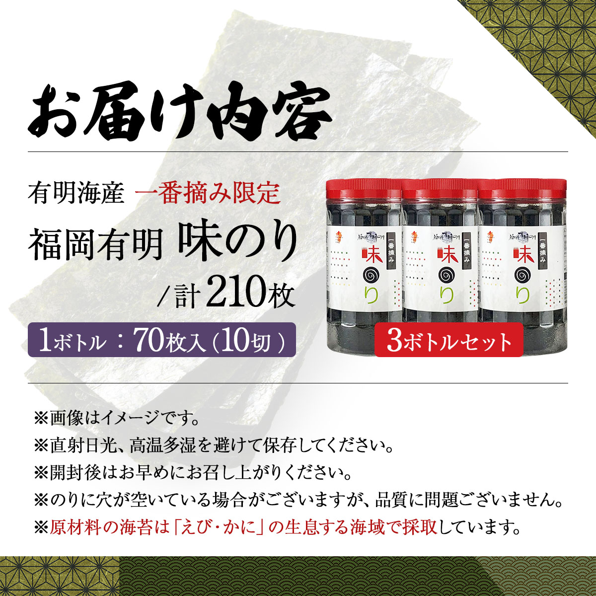 【有明海産一番摘み限定】福岡有明のり(味のり)計210枚(10切70枚×3本)SM018