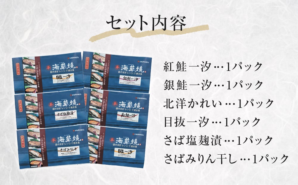 - 漬魚 レンジ焼き魚 海草焼 6種6枚セット 冷凍 銀鮭 紅鮭 さけ サケ さば サバ 焼き魚 鮭 鯖 かれい 目抜 塩麹漬け みりん干し 漬け魚 セット 簡単調理 温めるただけ レンチン 惣菜 和風惣菜 おかず 和食 一人暮らし 魚 切り身 昆布巻 宮城県 石巻市