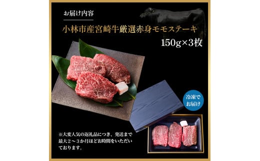 【A4等級以上】宮崎牛 厳選赤身モモステーキ 150g×3枚( 小林市産 国産 牛肉 黒毛和牛 宮崎牛 赤身 ステーキ ももステーキ 産地直送 生産者直売 )