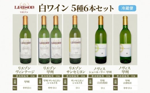 - 白ワイン 5種 6本 セット 720ml ヴィンテージ 甲州 サンセミヨン シュールリー 甲州 甲州 Liaison NOVICE リエゾン ノヴィス フルボトル ワイン お酒 飲み比べ 山梨 日川中央葡萄酒 送料無料 山梨県 笛吹市 177-7-35