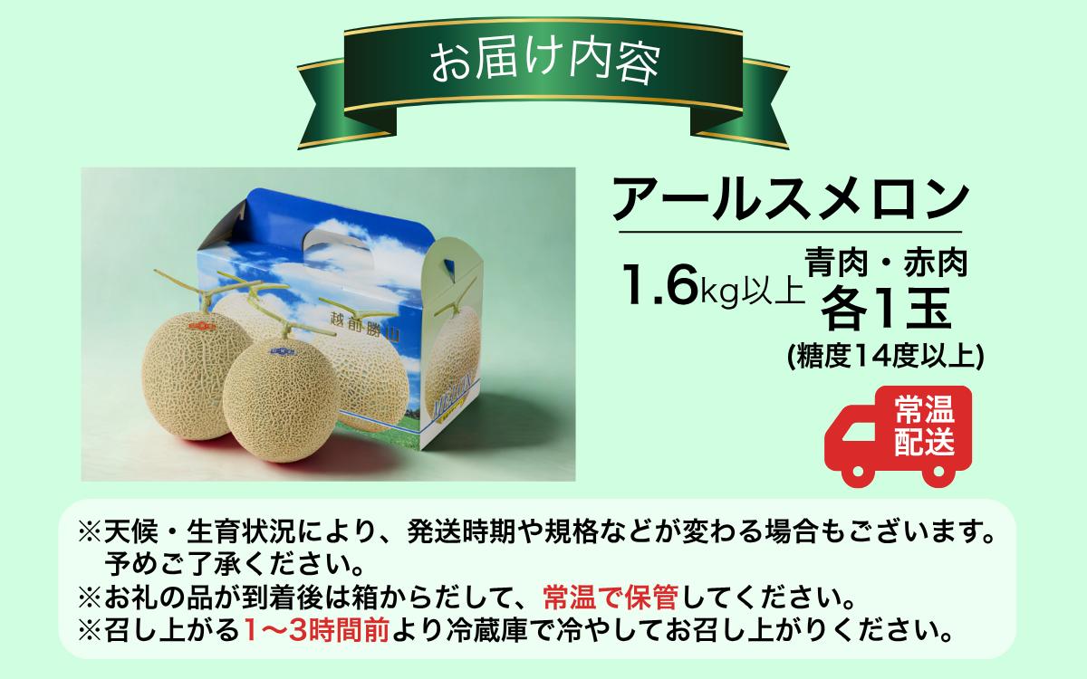 - 【令和8年産 先行予約・数量限定!】令和8年産 若猪野アールスメロン 1.6kg 以上 (赤肉・青肉各1玉)合計 2玉 箱入り ※2026年7月下旬より順次発送 [A-011016]