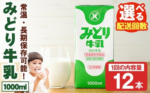 - <お届け回数が選べる!>みどり牛乳(1000ml×12本×1回・毎月3回・隔月3回・隔月6回) 定期便 常温 保存 ミルク 生乳 長期保存 ロングライフ 乳製品 防災 災害 備蓄【115700201・215700401・215700501・215700601】【九州乳業】