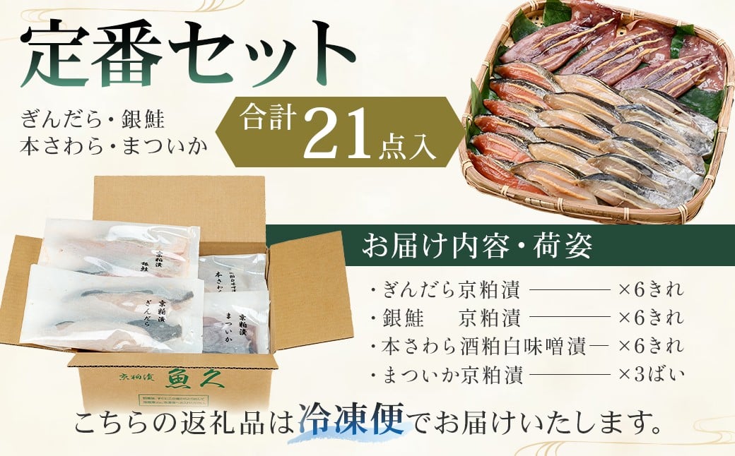 - 【京粕漬 魚久】ぎんだら・銀鮭・本さわら・まついか定番セット 合計21点入 【魚久 粕漬け 味付き タラ 鮭 さわら いか 魚 冷凍 老舗 お取り寄せ グルメ 食品 和食】
