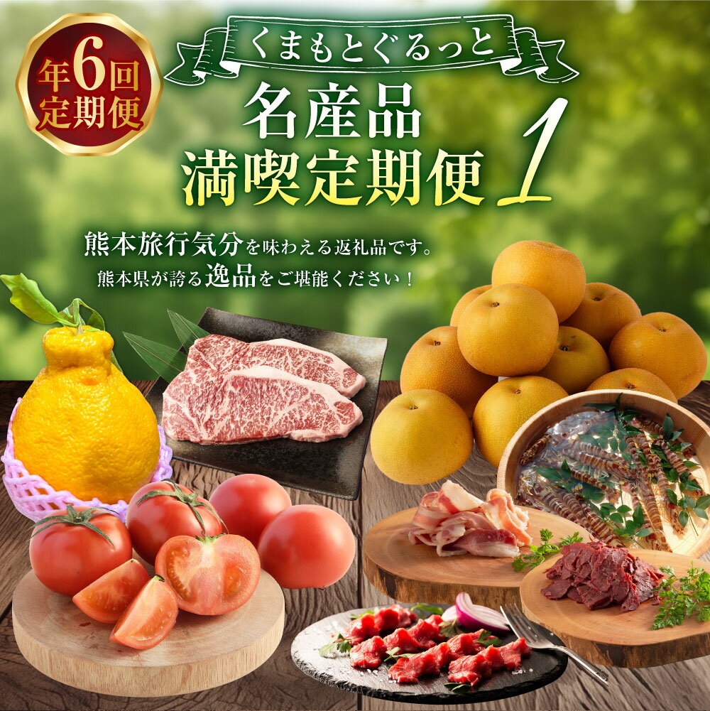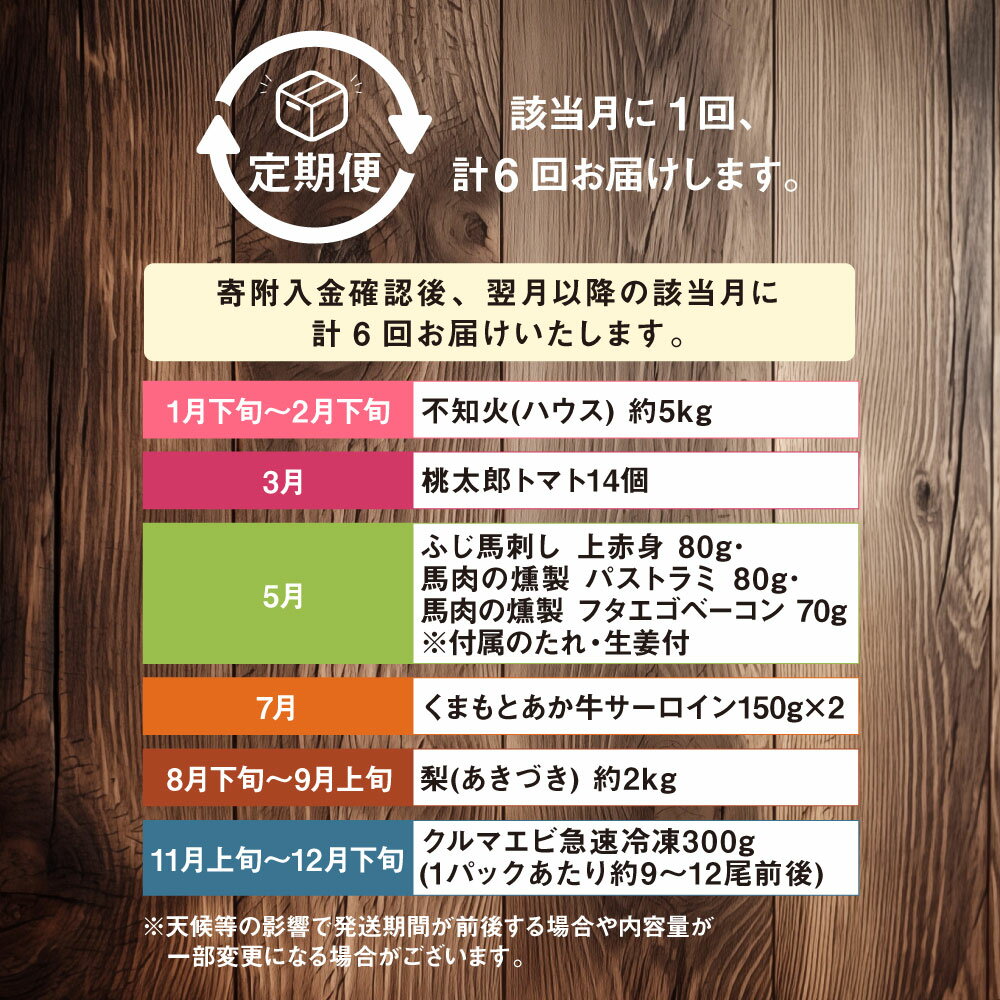 - 【ふるさと納税】【年6回定期便】くまもとぐるっと名産品満喫定期便1 全6回 不知火 しらぬい トマト 桃太郎トマト 馬刺し 赤身 フタエゴ パストラミ くまもとあか牛 サーロイン あきづき 梨 車海老 海老 魚介 柑橘 果物 野菜 肉 お肉 牛肉 馬肉