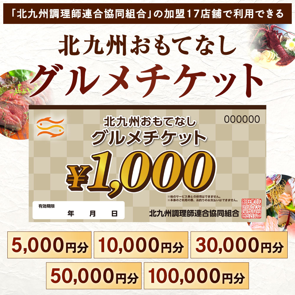 - 【ふるさと納税】北九州 おもてなしグルメチケット 選べる 5,000円分 / 10,000円分 / 30,000円分 / 50,000円分 / 100,000円分 お食事 1枚1,000円分 飲食 ご飯 お食事 記念 お祝い ディナー ランチ 外食 特別 クーポン券 チケット 福岡県北九州市