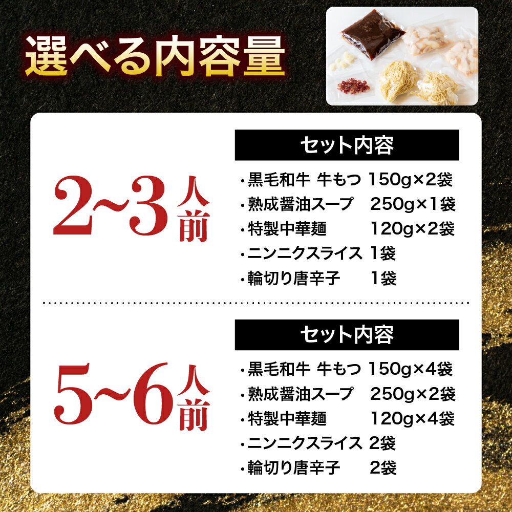 - 【ふるさと納税】黒毛和牛 牛もつ鍋セット 熟成しょうゆ味 選べるセット 2~3人前 / 5~6人前 もつ鍋 醤油 スープ ホルモン モツ 〆 ラーメン 中華麺 付き お取り寄せ グルメ 送料無料 鉄板将軍かん吉 大阪府 吹田市