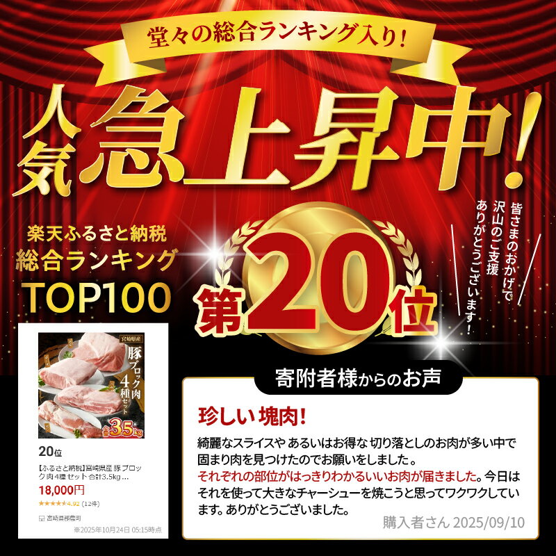 - 【ふるさと納税】宮崎県産 豚 ブロック 肉 4種 セット 合計3.5kg 豚肉 ロース バラ モモ ヒレ 国産 おすすめ 詰め合わせ かたまり 塊肉 ステーキ 焼肉 とんかつ 角煮 チャーシュー 晩ご飯 おかず お弁当 贈り物 ギフト 贈答 パーティー お祝い 記念日 冷凍 都農町 送料無料