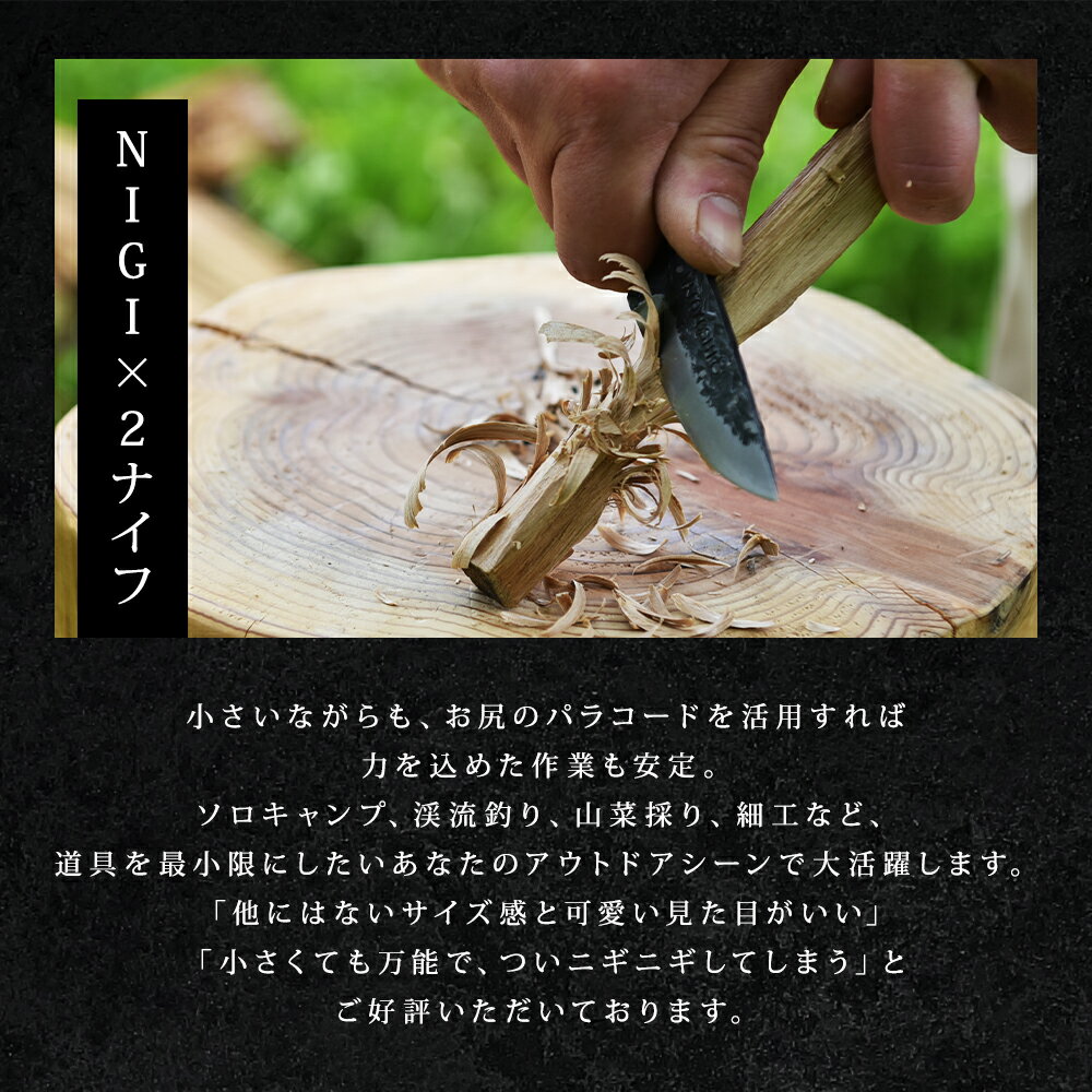 - 【ふるさと納税】<選べる名入りあり・なし>NIGI×2(にぎにぎ)ナイフ コンパクトナイフ 鉄 鋼 青紙2号 刃渡7cm 包丁 小型 ミニ 携帯 アウトドア 料理道具 調理器具 キッチン用品 パラコード 牛革ケース付き ソロキャンプ 渓流釣り 山菜採り 細工 日本製 送料無料