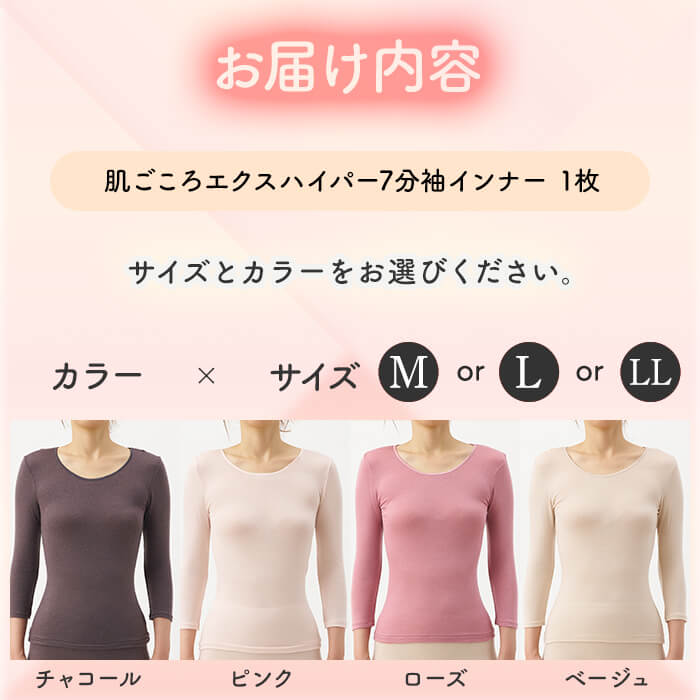 - 【ふるさと納税】 <期間限定><選べるサイズ・4カラー>肌ごころエクスハイパー7分袖インナー(1枚/M〜LL/カラー4色) 肌着 レディースインナー あったか 吸湿発熱 裏起毛 伸縮インナー 日本製 ベージュ チャコール ピンク ローズ 七分袖 婦人肌着 新登場 【m84-01】【アズ】