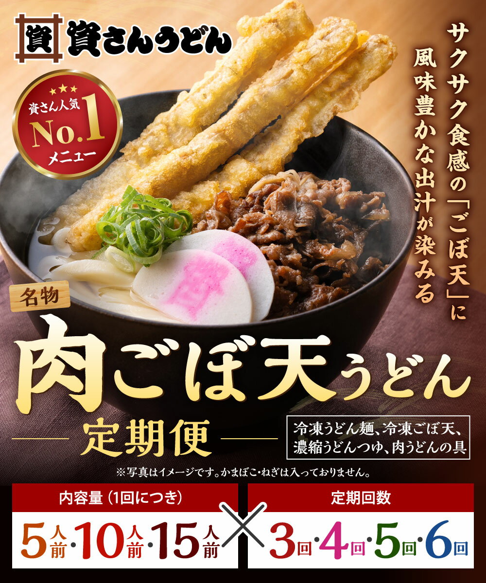 - 【ふるさと納税】【定期便】資さん 肉ごぼ天うどん 《選べる内容量》5人前 / 10人前 / 15人前 《選べる定期回数》3ヶ月 / 4ヶ月 / 5ヶ月 / 6ヶ月定期便 冷凍うどん麺 ごぼ天 肉うどん 牛肉 北九名物 冷凍 名物 福岡県 北九州市 資さんうどん