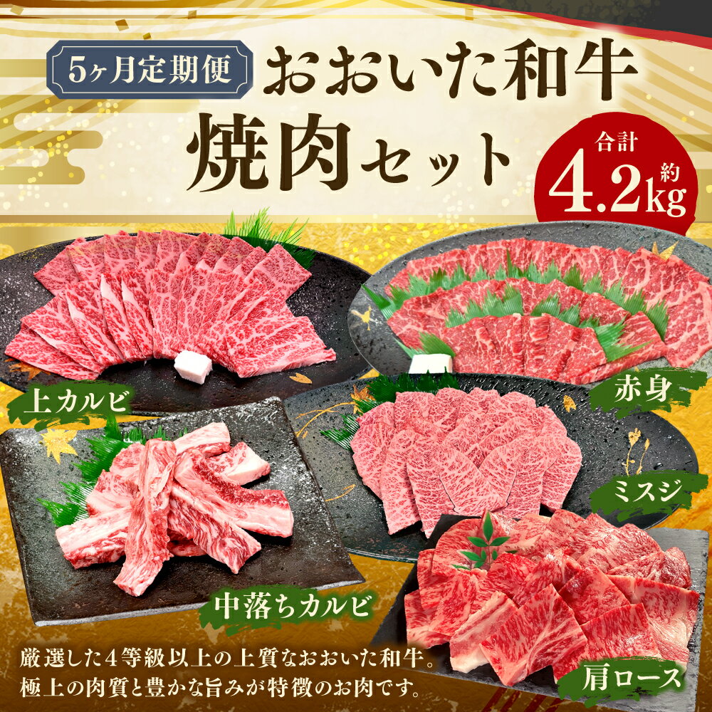 - 【ふるさと納税】【5ヶ月定期便】毎月届く 焼肉セット! おおいた和牛 焼肉セット 合計4.2kg 牛肉 肉 お肉 和牛 国産牛 4等級以上 お楽しみ 食べ比べ ごちそう 大分県産 竹田市 送料無料