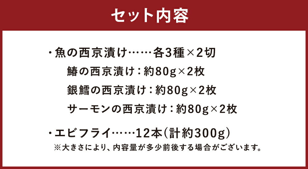 【ふるさと納税】磯鷸之庄 魚の西京漬け(各3種×2切入)・エビフライ(12本入)のギフトセット 鰆・銀鱈・サーモン さわら ギンダラ 味噌 海老 おかず 惣菜 魚介類 えびフライ そうざい 魚 セット 食べ比べ 漬け魚 冷凍 熊本県 益城町 送料無料