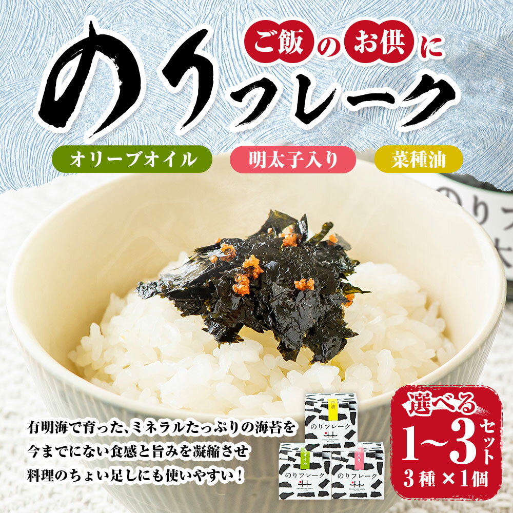 - 【ふるさと納税】<選べる内容量> のりフレーク 3種(オリーブオイル・明太子・菜種油) 1セット 2セット 3セット 1セットあたり計195g(65g×3個(各1個)) 海苔 有明海苔 ごはんのお供 ご飯 福岡県 みやま市 送料無料 A315 B56 B55