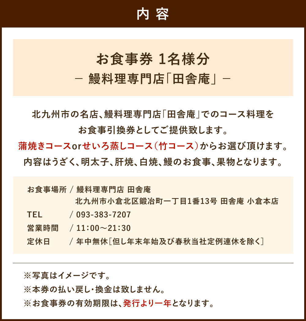 - 【ふるさと納税】鰻料理専門店「田舎庵」 お食事引換券【北九州市ふるさと納税限定】 1名様分 食事券 チケット 鰻 うなぎ 蒲焼きコースまたはせいろ蒸しコース(竹) 食事 ランチ ディナー コース料理 福岡県北九州市 【有効期限:発行より一年】