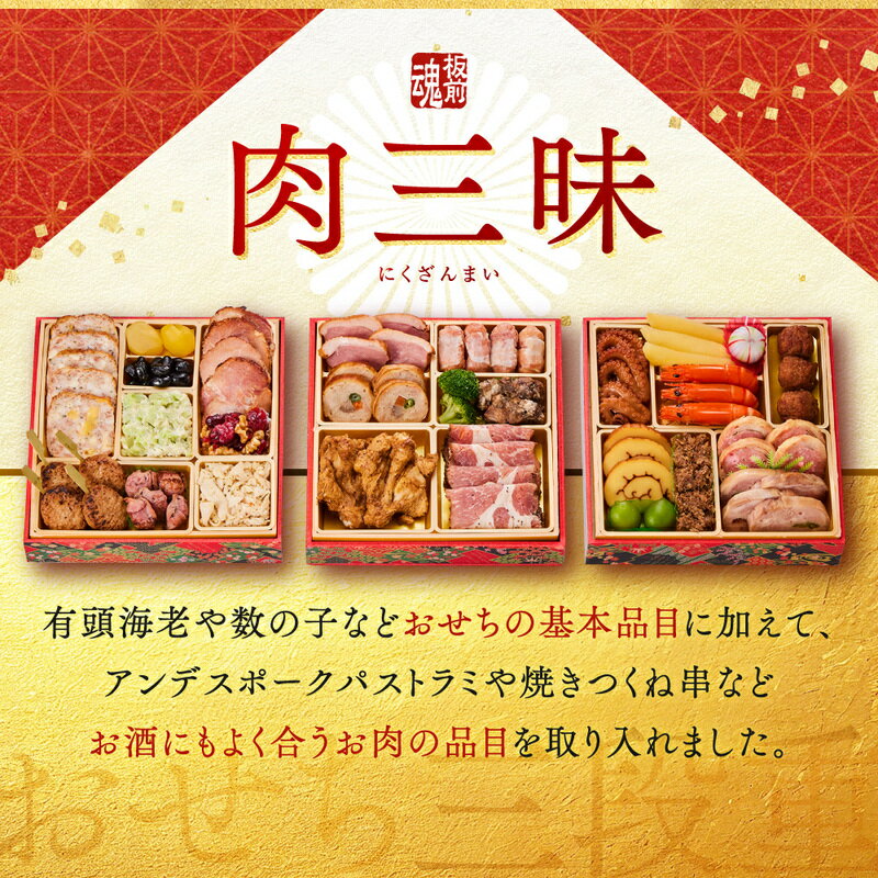 - 【ふるさと納税】おせち 板前魂の肉三昧おせち 2026年 和洋風 三段重 6.8寸 30品 3人前 ステーキ 豚角煮 ユッケ風ローストビーフ 生ハム 付き 期間限定 おせち料理 板前魂 三段 和風 洋風 予約 冷凍 泉佐野市 送料無料 先行予約 年内発送 肉