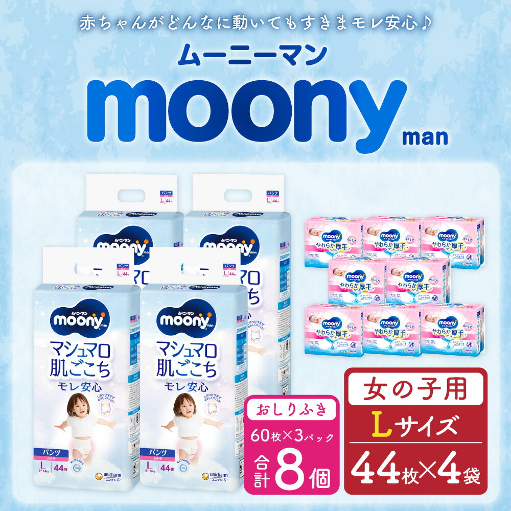 - 【ふるさと納税】ムーニーマン 女の子用 Lサイズ 44枚×4袋 総合計176枚 おしりふき やわらか 厚手 詰替 60枚×3個入×8パック 2種 セット おむつ 子供用 ベビー用品 消耗品 ユニ・チャーム ウエット パンツ 福岡県 苅田町 2個口発送 送料無料